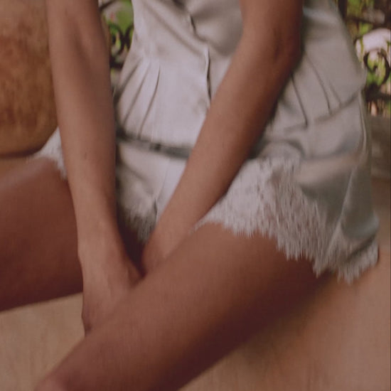 A nostalgic 1940s-inspired beauty, the Yvette Top is made from sublime silk satin, detailed with darts at the front and back bodice. Inset lace, satin-covered buttons, and scalloped edge lace add notes of vintage charm.