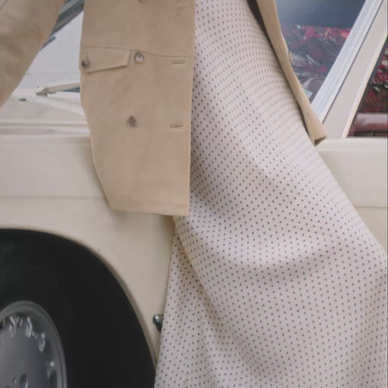 The DÔEN Heirloom Hutton Suede Trench reimagines a classic trench silhouette in soft goat suede sourced from a certified, responsibly tannery. In a nod to 1960s styles, the Hutton is tailored with a slim fit, finished with a detachable belt to cinch the waist, two roomy hip pockets, and faux horn buttons.